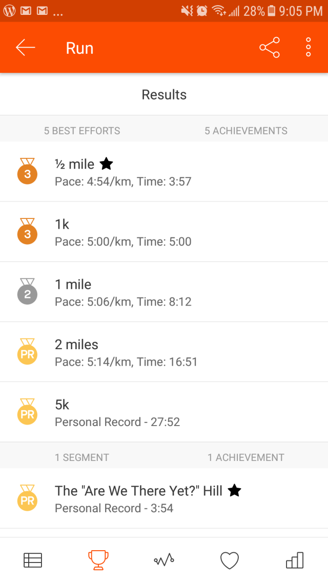 As always, I felt out of breath in the first few km so I was huffing and puffing while running to the track. According to Strava, I ran between 4-5:00 min/km for my hard intervals and around 6:00 for recovery. Overall, I felt it was a good pace for me and I got a 5k PB (YAY!). I even pushed myself at the end and got a PB at the Canadian Tire “Are we there yet?” hill! (double YAY!)