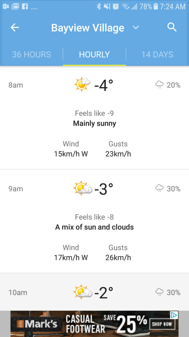 It is April and Old Man Winter still has his grip on us…but I’m not complaining. The forecast was -4C (feels like -9C) today. I had 3 top layers, thick gloves, and earmuffs but I ended up being too hot because the sun was out and there wasn’t a lot of wind (unlike Wednesday night). It is actually really nice to still be running in this cold (but not too cold) weather. Runners are probably the only crazy people who don’t want the weather to warm up!