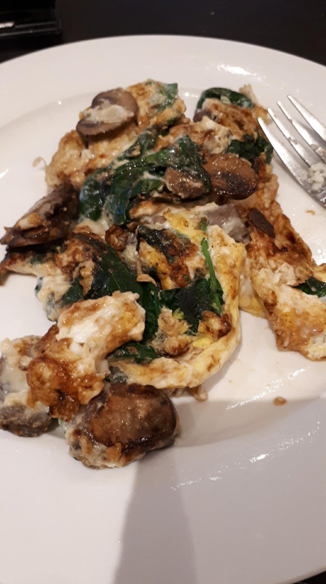 - Post-run: sesame snaps on my way home, Spinach/mushroom/cheese omelette (well, it was supposed to be an omelette but it looked more like scrambled eggs!)