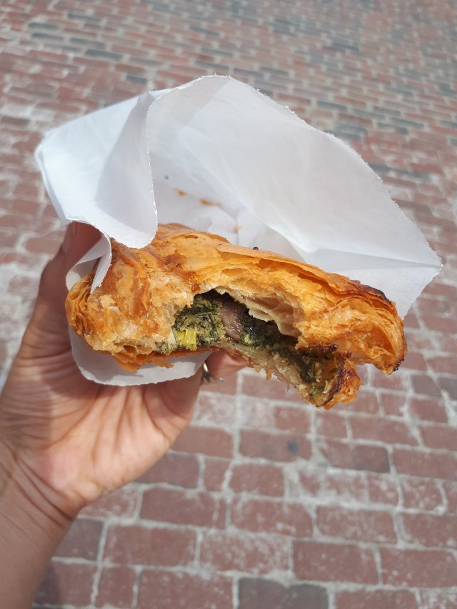 We finally got to the Distillery District and we bought some snacks. I got this amazing Spinach and feta turnover. So flakey!!! 😍