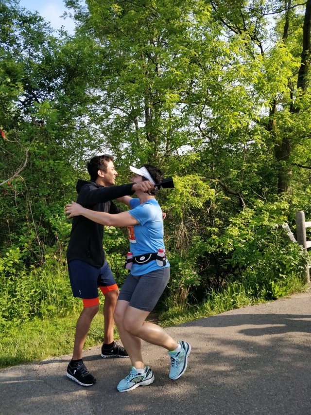 At the turnaround point, Benson was waiting for me on his bike and taking a video. That gave me another boost of energy to get through the next couple of km’s. This was also when I saw Maria and Lindsay cheering for me as they were running back with Sheena. By the time I saw the ninja cheer squad the third time, I felt like I was dying. It was getting really hot and my legs were heavy as lead. I actually said to Maggie and Tracey “I’m dying” as I ran past them. π Then I saw Parm and Lisa again and gave Parm another hug. I needed as much energy as I could get!