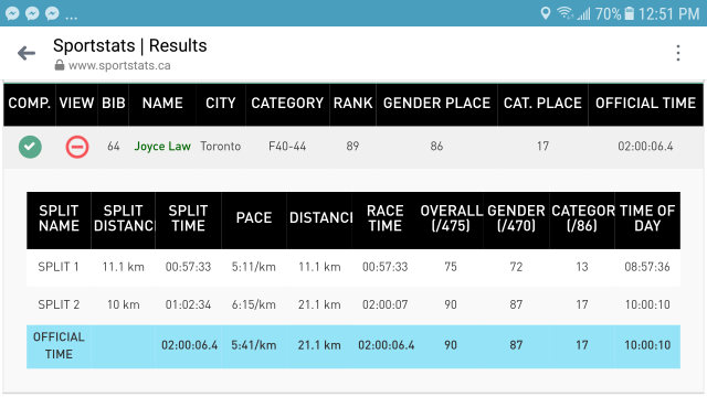 The last 3 km’s were the longest 3 km’s I’ve ever done in my life. At km 17, my Strava started to go out of sync with the km markers on the course, lagging about 200m. It was probably having a hard time getting the GPS signal because it was stuffed inside my bra π. By km 19, it was so far off that I had no idea what my real time or pace was. I was pretty sure that I wasn’t going to get a sub-2 by then and I wasn’t even sure if I would get a PB. I continued to feel like I was walking even though I was running. At one point, my Strava was telling me my pace was 6:30 min/km which is about 1 minute slower than my target pace for a sub-2.