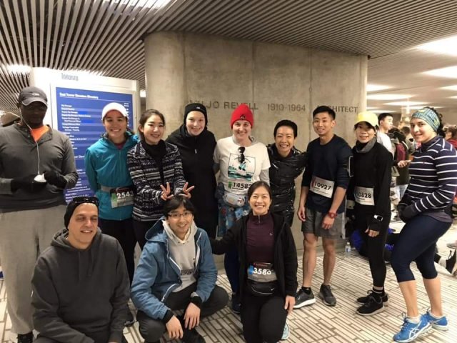 I woke up at 5:40am and did my morning routine and had my pre-race breakfast of PB&J. It was still pitch black out when I caught the bus to our meet-up point and we carpooled downtown to the start of the race. Thanks to our carpool drivers, we got there super early so we had lots of time to get organized. I love that we were not rushed. We checked our bags and stayed warm inside City Hall as more Ninjas joined us.