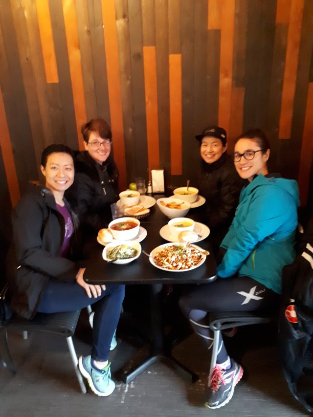 We went to a place called Caro for dinner. Since they don’t take reservations, I thought it would be ok as long as we showed up before 6pm. Afterall, this is Hamilton. Nope. When we arrived, the place was packed with a 1 hour wait. So we waited for Sally to show up and went for the next closest restaurant based on Yelp’s recommendation. MERK was a tapas restaurant which probably isn’t the best choice for a pre-race meal because we tried a lot of different dishes. Major GI risk! But the food was so good we even forgot to take pictures. I love tapas! We got a picture at the end and of course, Sally is flipping the bird. I’m glad she drove all the way here from Ottawa. It was great to catch up with her.