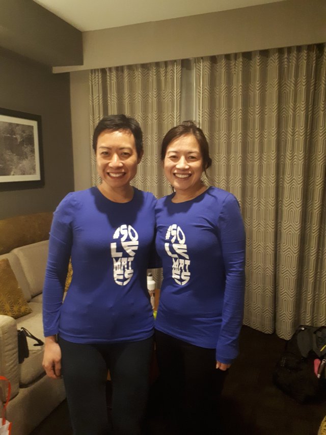 A photo with our #solemates shirts because we didn’t get one at the restaurant. We are the same height! πŸ˜‚