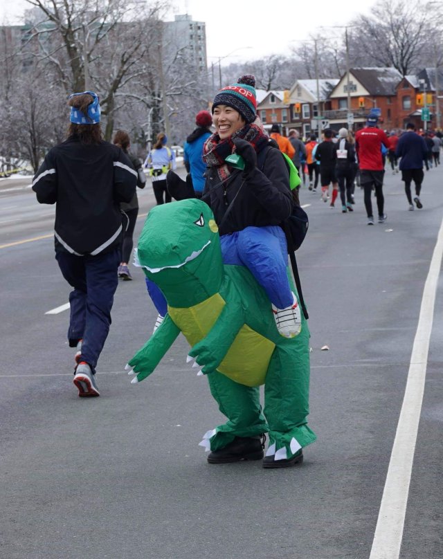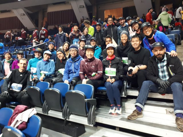 This was the most stressful part of the day. Originally I had told everyone to meet us at the Federal Building because I thought it was going to be open. Turns out it wasn’t. πŸ˜” Maria was one of the first to arrive and she was at the Tim Hortons at Jackson Square so that’s where we ended up distributing most of the bibs. Some people got lost trying to find it – thank goodness for phones. Then we moved into the stadium where there were a million people waiting for the race to start. The most stressful part was getting the bibs to Sandra and Jim because they were stuck in traffic. I went out to meet them in the front and my claustrophobia kicked in. I almost threw up. Thank goodness they arrived 15 minutes before the race start.