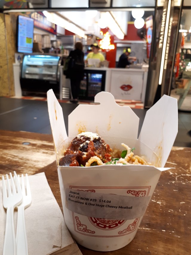 Kit pick-up was held at the NYRR Run Centre which is a store that sells running stuff and looks like they host a lot of group runs. There were lots of runners who had just come back from a run and we chatted with one of them. After race kit pick-up, we went to line up for rush tickets for the Book of Mormon. We met Katie and Dora in the line and had a great chat with them. More on Katie later.After we scored some standing tickets for the matinée show, we had ~1.5 hours to eat lunch. We walked to a fresh pasta place called Pasta on Hudson so I could load up on carbs. I love fresh pasta! I’ve never had pasta from a Chinese takeout container but it was delicious! 🥡 😂