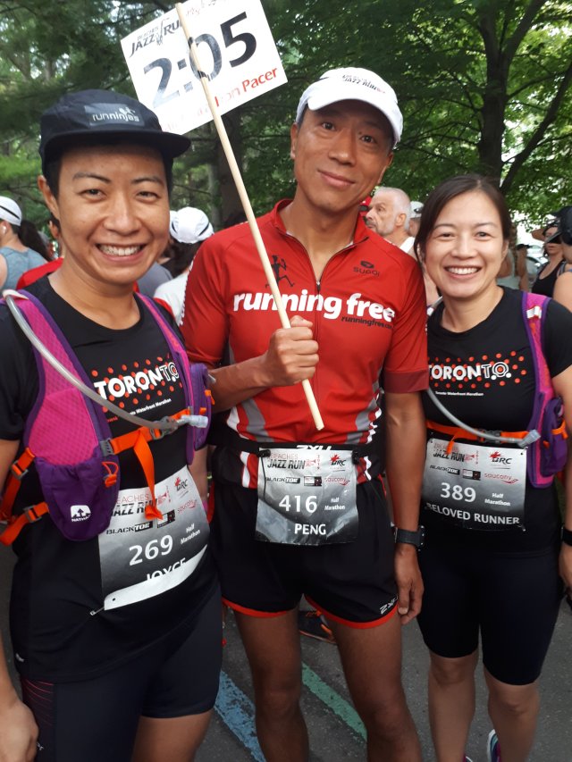 Then I lined up for the porta potty. Even though I didnt really need to go but i knew I would regret it if i didn’t. I’m glad I went but i made it to the start line with just enough time to take an Endurance Tap and take these photos with Denoja, Anshul, and our favourite pacer Peng.