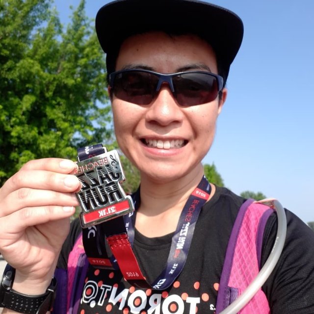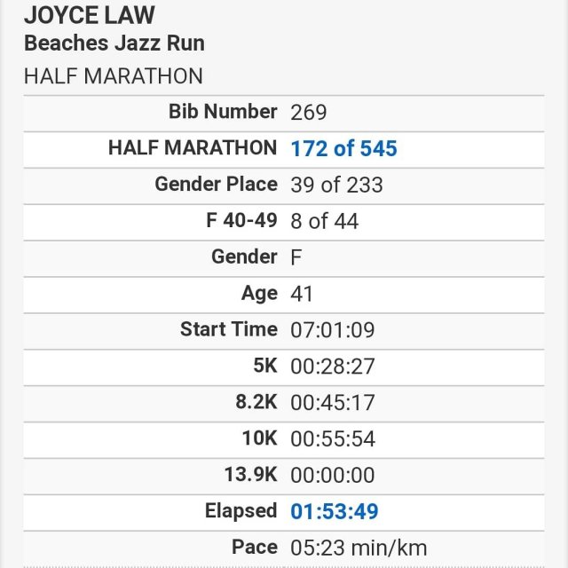 At about 13k, I told her she needed to go all out for the last 7k because I felt I was holding her back and she needed to PB. So at 14k, she gunned it and got a huge PB! Even I was able to pass the 2:00 and 1:55 bunnies and it felt so good to be able to catch up to them. I got a great burst of energy when I saw Matt, Chris, Tracey, Gillian, and Sylvia cheering for me near the finish line. It was awesome! I ended up 1 minute slower than Lisa but still got a 1:30 PB and my first negative split race. I placed 8/44 in my age group. So happy!!!