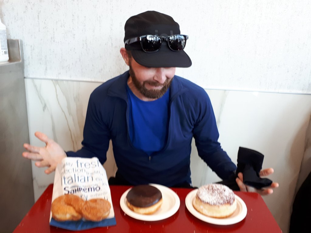 After the race, the plan was to run to SanRemo and back. Parm was clearly injured and didn’t make it all the way there. Jim and I had a donut and brought a donut back for Parm, who was waiting in the car for us.