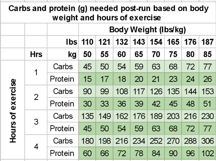 I’ve put together this handy dandy chart so you can have an idea of how much carbs and protein you need post-run based on your body weight and hours of exercise.